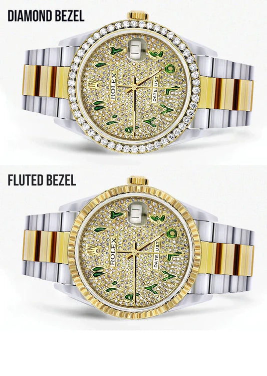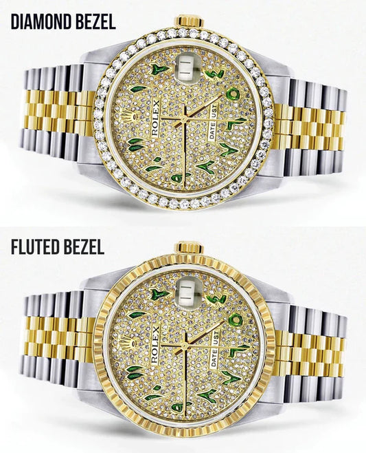 Diamond Gold Rolex Datejust Watch 16233 | 36MM | Custom Green Arabic Full Diamond Dial | Stainless Steel | Oyster Band